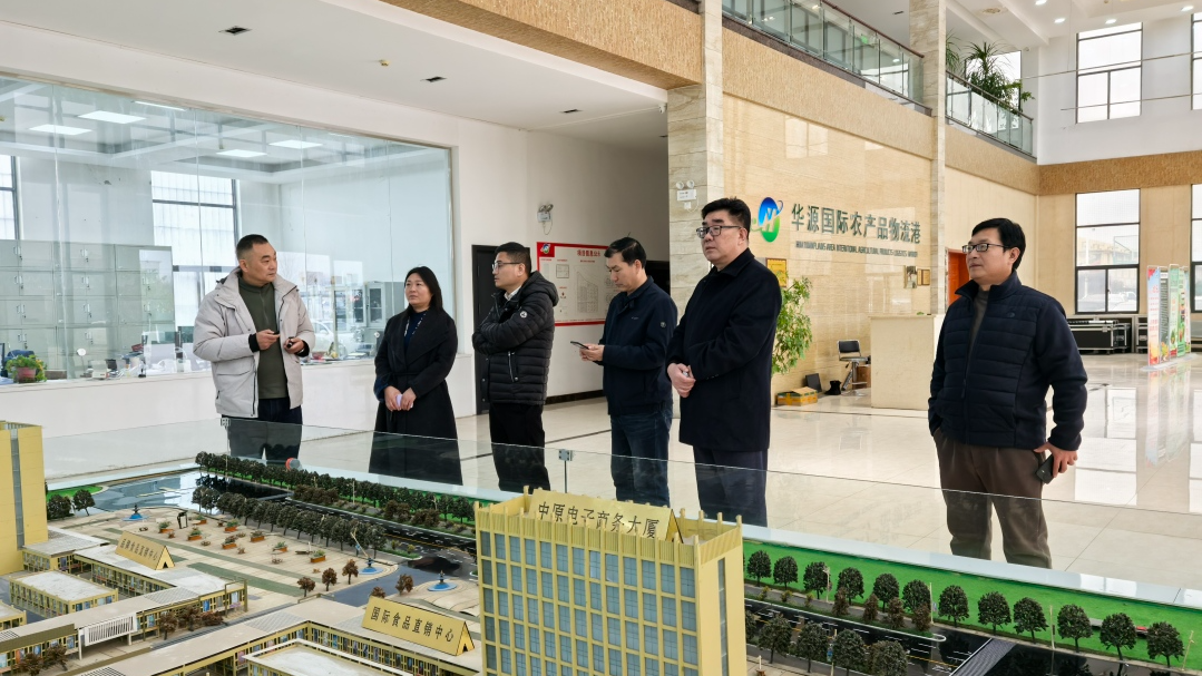 在刘世田、王鹏的陪同下,沈东山一行实地考察了华源国际农产品物流港园区的冷链仓储中心、农产品分拣加工区、数字化交易大厅及城乡共配枢纽等重点区域,详细了解物流港在保障市场供应、促进农产品流通等方面的发展成效。
